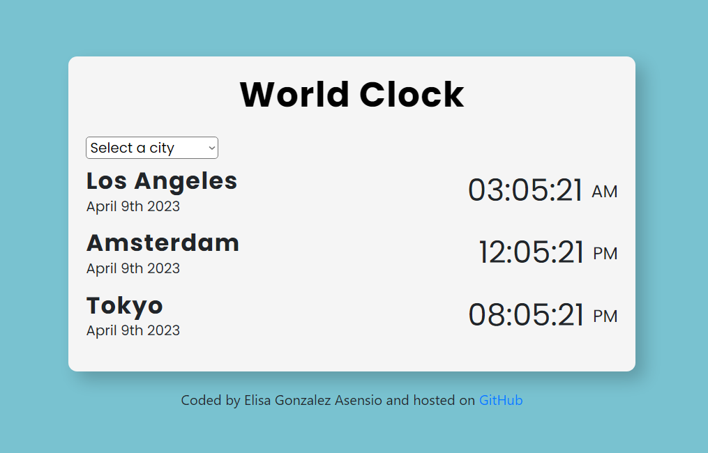 The world clock website that I created is a useful tool for people who need to keep track of time in different parts of the world. This project focused on the formatting of time and dates using an API and moment.js. The site displays the current times of various cities around the world, making it easy for users to see what time it is in different time zones. It also features a drop-down menu where users can select a city of their choice to display just the time of that particular city. The site is user-friendly and provides a clean and simple layout, making it easy for users to navigate and find the information they need.